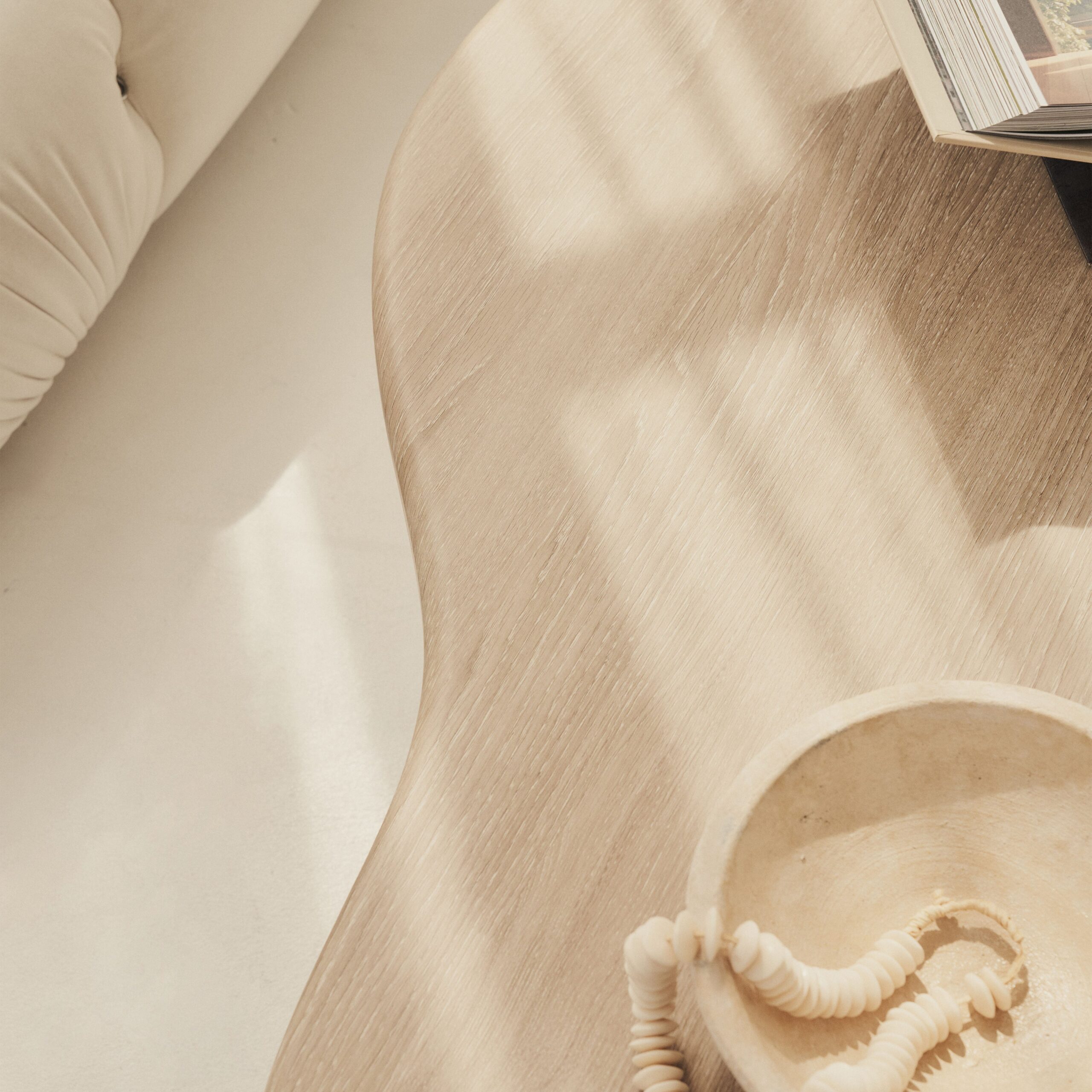 Elevate your living space with the Savanna Coffee Table. A sleek and simple coffee table that incorporates a minimalistic design approach with a sophisticated washed wood veneer finish and distinct irregular shape, adding a sense of unique flair to your room. Perfect for displaying your favourite decor or for keeping everyday essentials within reach.